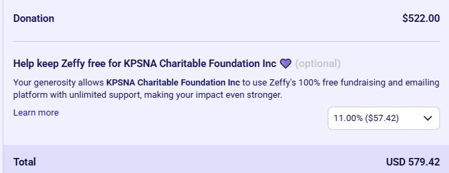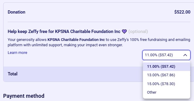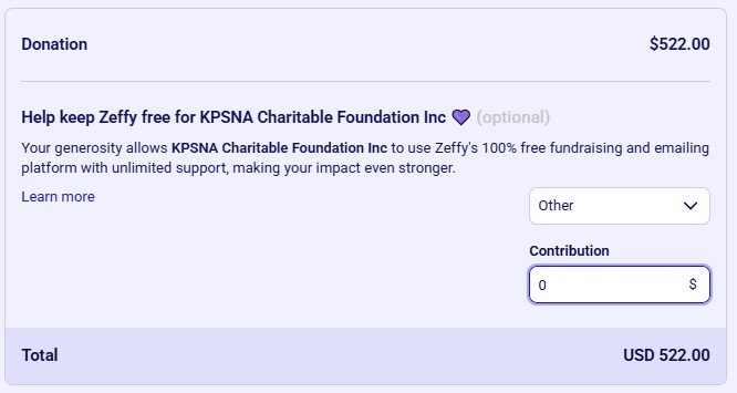 When using Zeffy, you'll notice an option to donate to Zeffy itself. If you'd prefer not to make a donation, simply select "Other" and enter 0 as the amount.